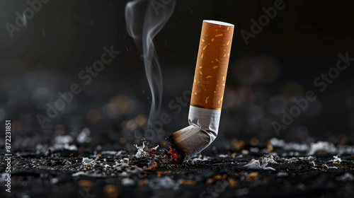 Smoldering Cigarette Butt Extinguished on Asphalt - Close-up Detail