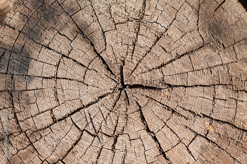 Smooth cross section brown tree stump slice with age rings. Shows wood grain and texture isolated on white with depth.