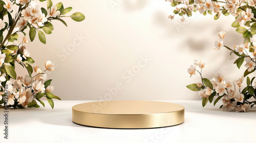 smooth gold pedestal surrounded by delicate flowers creates elegant display. Perfect for showcasing products or decorative items