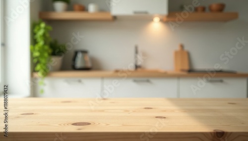 Smooth light wood table, softly blurred kitchen scene, image, smooth