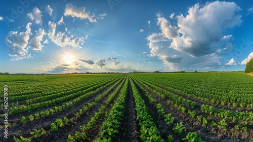 smooth rows of green soybean plantations on blue sky background, field