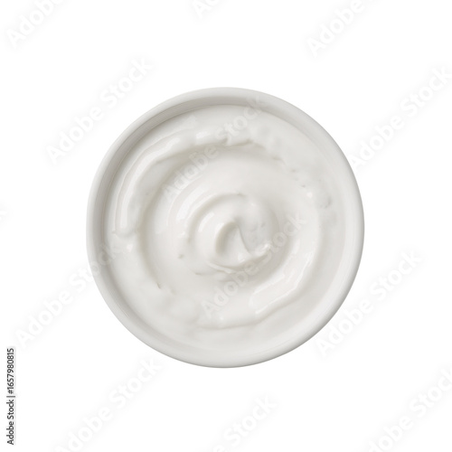 Smooth white cream in a small bowl, showcasing its velvety texture on isolated transparent backdrop