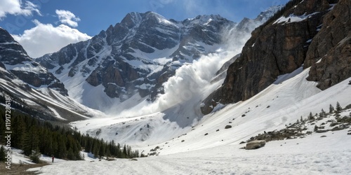 Snow avalanche occurs in mountain valley surrounded by rugged peaks during sunny winter day