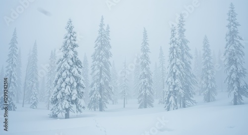 Snow covered fir trees in winter foggy forest. Landscape photography. Peaceful nature scene. Background for website, banner. Scenic view