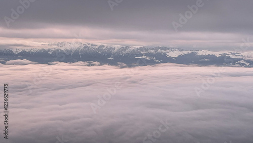 snow covered mountains, sunrise on the mountain, viewpoint from Piatra Craiului Mountains to Bucegi Mountains, Romania