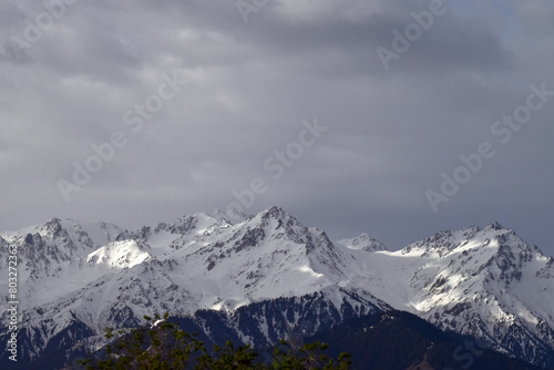 Snow covered mountains in cloudy weather, Tian Shan, large system of mountain ranges in Central Asia