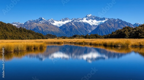 Snow-capped mountains reflected in a clear blue lake, surrounded by golden grasses under a bright, cloudless sky.
