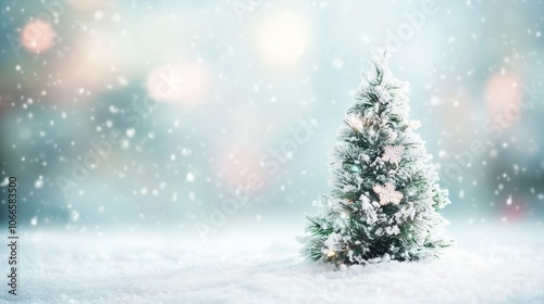 Snow-covered Christmas tree in a serene winter landscape during a gentle snowfall