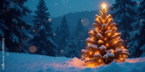 snow-covered Christmas tree lit with twinkling lights, holiday, serene, winter