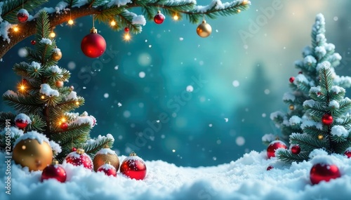 Snow-covered fir branches are adorned with colorful ornaments and garlands in a whimsical winter wonderland scene, whimsical, background