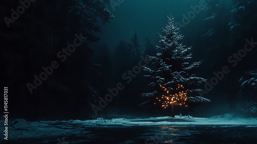 Snow-covered fir tree with warm lights in a dark winter forest.