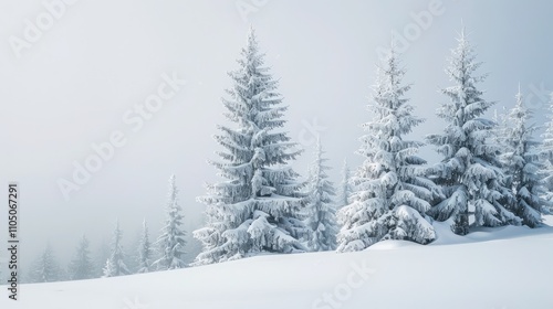 Snow-covered fir trees in scenic landscape with copy-space for New Year wishes.