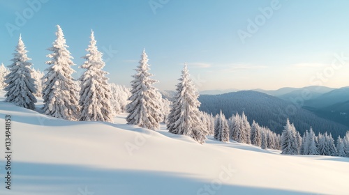 Snow-covered landscape, tall evergreen trees blanketed in white, serene winter scene with clear blue sky, perfect for winter themes.
