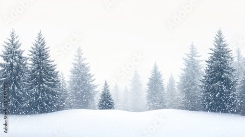 Snow-covered pine forest under a pale winter sky, tranquil and serene winter landscape scene