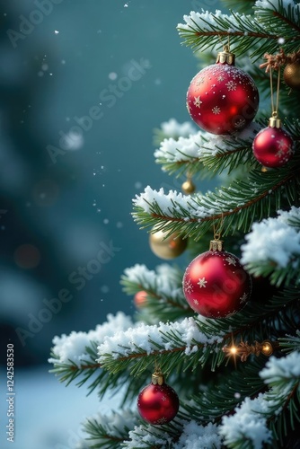 Snow-covered pine tree branches with ornaments, , decorations, christmas balls