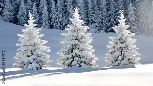 Snow-covered pine trees in a winter wonderland with soft sunlight filtering through