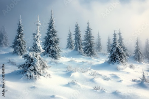 Snow-covered pine trees on a gentle hillside under a cloudy sky creating a serene winter landscape