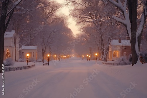 Snow-covered street at twilight, illuminated by lampposts.