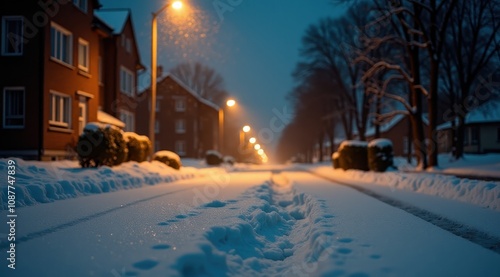 Snow-covered street illuminated by warm streetlights at dusk, with footprints leading into the distance surrounded by quiet, serene houses