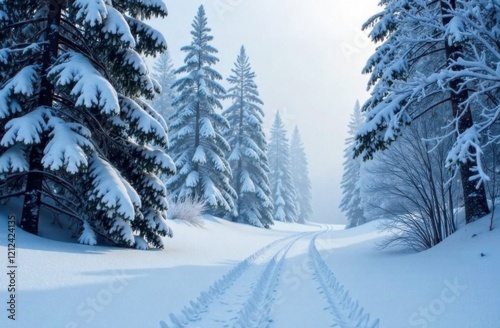 Snow-covered trees and a path with fresh tracks in a serene winter landscape, illuminated by soft morning light