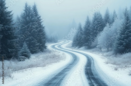 Snow-covered winding road through a dense frosty evergreen forest on a foggy winter day, evoking a serene and quiet atmosphere