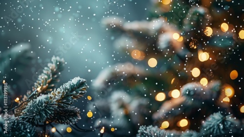 Snow-dusted evergreen branches with warm lights twinkling in the background. Festive winter scene.