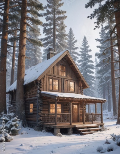 Snow-dusted pines frame a rustic cabin, soft snowfall blankets the winter woods , winter wonderland, cozy, square