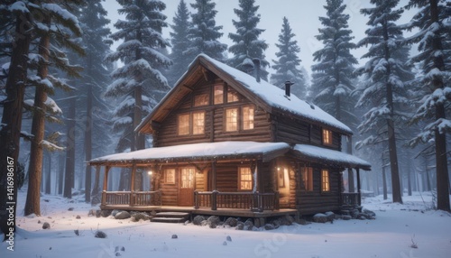Snow-dusted pines frame cozy cabin, soft snowfall , texture, silhouette, woodland