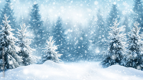 Snowfall gently covering a serene winter landscape with evergreen trees in a forest