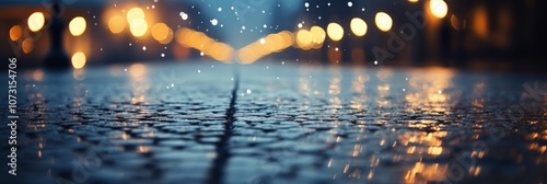 Snowflakes adorned with street lights shine against a blurred bokeh background at night