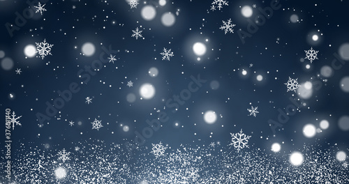 Snowflakes and bokeh lights on the blue Merry Christmas background. 3D rendering 3D illustration