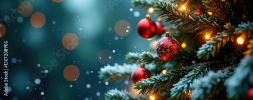 Snowflakes fall gently on the Christmas tree's red branches, decorated tree, twinkling lights, festive flowers