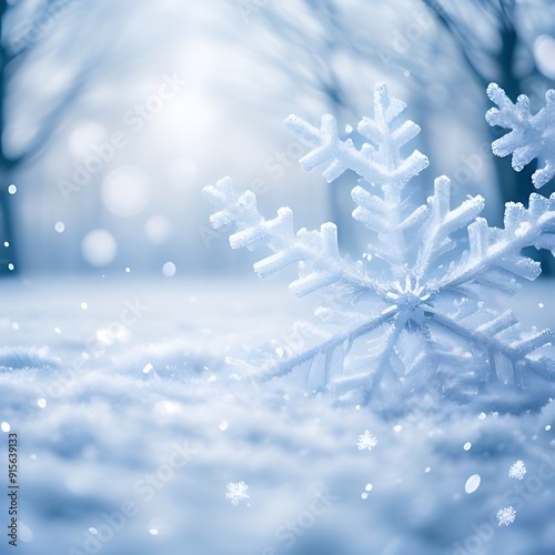 Snowflakes falling against frosty trees in winter blur.