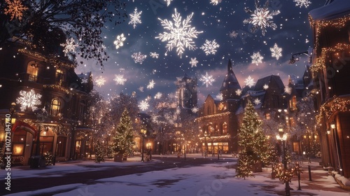 Snowflakes floating over a city square filled with holiday decorations and joyful Christmas vibes