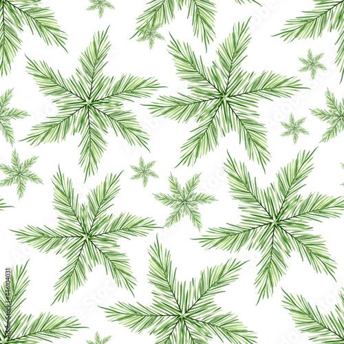 Snowflakes from fir branches watercolor seamless pattern. Template for decorating designs and illustrations.
