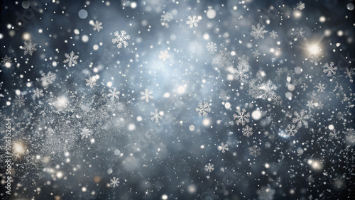 Snowflakes gently fall against soft, blurred background, creating serene winter atmosphere filled with sparkling lights and sense of tranquility