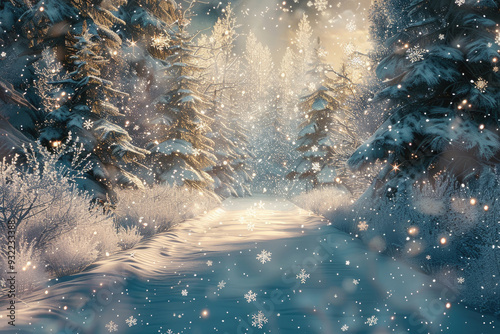 Snowflakes gently fall on a peaceful forest path illuminated by soft sunlight in a winter wonderland