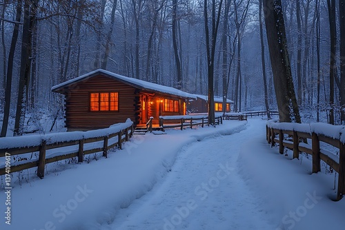 Snowy Cabin Path at Dusk