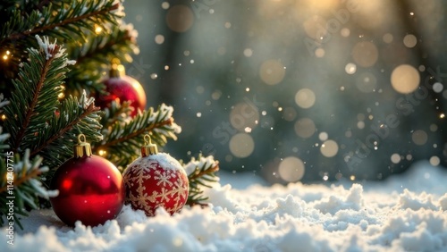 Snowy Christmas Background mockup, red ball on tree, nature snowflakes and magic golden bokeh lights with copy space, snow winter scene for greeting card, banner, product or advertisement, close up