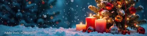 Snowy Christmas tree with candles and ornaments, decorated with garlands and lights , garlands, tree, candles