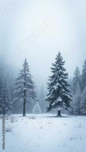 Snowy field with two trees in the foreground and a large tree in the background. The trees are bare and covered in snow. The sky is cloudy and the snow is falling
