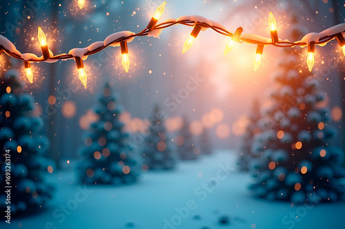 Snowy Forest Scene with Festive Christmas Lights and Evergreen T