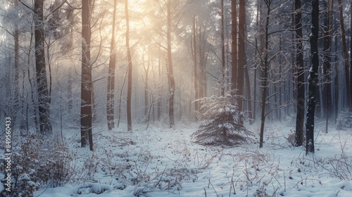 Snowy forest with sunlight