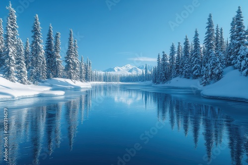Snowy landscape features frozen lake and snowcapped trees reflecting in clear blue water