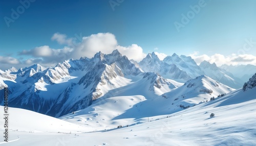 Snowy mountain peaks in Europe offer stunning winter scenery. Vast expanse of white snow covers high mountains, slopes. Clear blue sky with scattered clouds. Scenic winter landscape ideal for winter