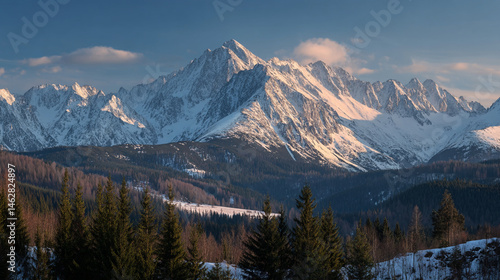 Snowy mountain range under a blue sky with a forest in the foreground during the daytime view scenery