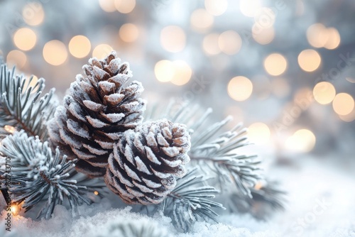Snowy pine cones and branches with blurred holiday lights in the background with generative ai