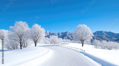 Snowy Road Winding Mountain Trees Serene Vibrant High-resolution Panoramic View Frosty Branches Peaceful Scene Mountain Range backdrop Bright Cold Winter Travel Advertisement