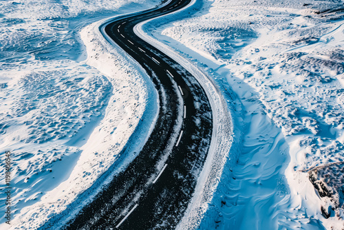 Snowy road with trees in the background. The road is curved and winding, and the snow is piled up on the side of the road. The scene is peaceful and serene, with the snow covering the ground