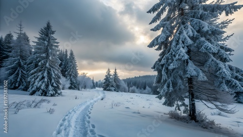 Snowy Trail in Winter Wonderland: A serene snow-covered landscape unfolds, featuring frosted evergreen trees, a winding trail, and a dramatic sky. Capturing the tranquility and beauty of winter.
